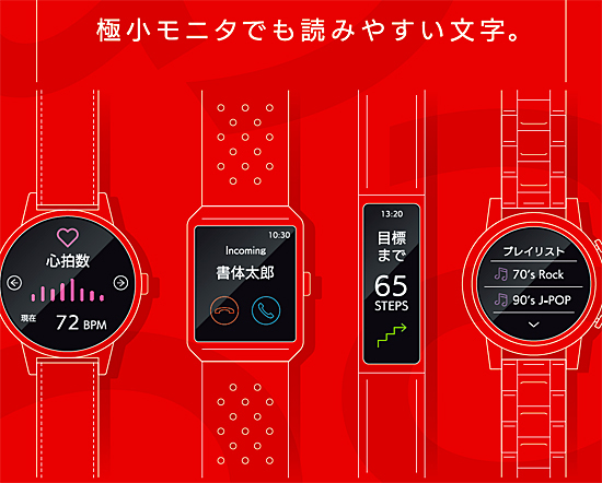濃度(ウェイトの違いによる全体的な黒み)、各文字の大きさなどの物理的な特徴が、フォントの可読性、視認性に多大な影響を与えることを理解した上で、極小画面デバイス向けフォントの開発ではその最適なバランスの追求に注力した。