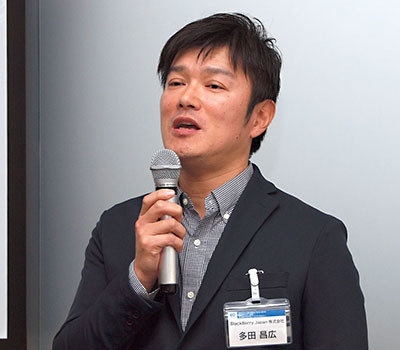 BlackBerry Japanの営業部でエンタープライズアカウントマネージャーを務める多田昌広氏は、モバイル端末のBYODを支援する同社の製品群を紹介。従業員の私物端末を業務に活用するBYODでは、端末調達コストの削減や、使い慣れた端末を利用することによる生産性向上が期待できるが、セキュリティー対策や統制のため、MDM(モバイル端末管理)ツールが求められることが多い。これに対してBlackBerryではMDMでなく、私物端末の中に業務専用の領域を作成し、業務アプリとそのデータを領域内のみに封じ込めるソリューションを提供する。MDMでは、自分の端末やデータを会社に管理されることに関して従業員から抵抗感が生まれることも多いが、同社のアプローチは端末ではなく業務アプリケーションだけを管理するものなので、セキュリティーを保ちながら高いユーザビリティやコスト効果を得られるのが特徴だという。