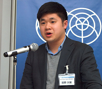Synology Japanの営業部の田野久敏セールスマネージャーは、同社が“次世代ファイルサーバー”と呼ぶ高機能NAS製品を紹介。企業のファイルサーバーに関しては、外出先からのアクセスや、業務端末やサーバーの確実なバックアップ、冗長構成への対応、管理業務負荷の低減といった要求が寄せられているが、従来このようなニーズをフルに満たす製品は100万円以上の価格帯が中心で、中小企業が導入するのは難しかった。SynologyのNASは、製品上で動作するさまざまなアプリケーションが無償で提供されているのが特徴で、きょう体価格10万円程度の機種でも、スナップショットや重複排除、自動バックアップなどの機能が利用できる。田野セールスマネージャーは、低コストでエンタープライズレベルの機能が使えることだけでなく、ハードウェアとソフトウェアの両方が同社から提供されていることで、サポート窓口が一元化され、複数ベンダーの製品の組み合わせよりも提案しやすい製品である点を強調した。
