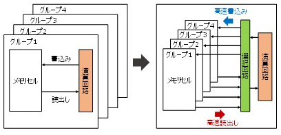 日立は今回、パラメータ(量子ビットに相当)の値を保持するメモリーセルへのデータアクセスを高速化することで、演算順序に従って一つの演算回路を四つのパラメータグループの間で切り替えながら共有できる技術を開発。四つのパラメータグループで切り替えるのは、CMOSアニーリングマシンが最適化問題の計算において、四つのグループごとに順次計算を行うため。これにより、1チップで3万976パラメータの高集積化に成功した。