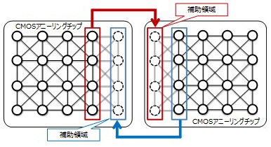 また、半導体チップの端部に、別チップのパラメータの値をコピーするための補助領域を設け、パラメータグループを計算する間に、次のパラメータグループのコピーを完了できるチップ間接続技術を開発。このチップを2枚接続し、名刺サイズで6万1952パラメータの最適化問題の計算が可能なCMOSアニーリングマシンを実現した。