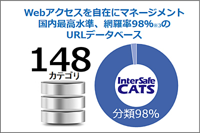 新バージョンのInterSafe CATS Ver.5.0では、フィルタリングカテゴリーを増強・細分化し、運用の柔軟性を高めることで、マルチデバイス・マルチプレイスでのより安全なインターネット利用環境を提供する。具体的には、これまで77カテゴリーだったフィルタリングカテゴリーを、国内ウェブフィルタリングソフト最大クラスとなる148カテゴリーへと大幅に増強する。高い網羅率により、さらに細かなアクセスマネジメントや、標的型攻撃対策、ホワイトリストによる運用が可能となる。