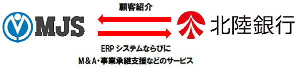 具体的には、MJSが北陸銀行から顧客である取引先の紹介を受け、地域の中小企業が抱える個々の経営課題を踏まえ、MJSの財務会計・税務を中心とするERPシステムなどの提供を行う。また、MJSの100%子会社であるMJS M&Aパートナーズ(mmap)を通じ、M&Aや事業承継などについての課題をもつ北陸銀行の顧客に対し、M&A・事業承継にかかわるアドバイザリー、コンサルティングなどのサービスを提供する。紹介された企業とは、MJSまたはmmapが直接取引を行う。
