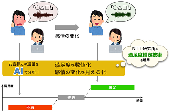 具体的には、世界最先端となるNTT研究所の深層学習技術に基づく満足度推定技術を用いて、顧客の声の高さやあいづちの取り方の変化、オペレーターの感謝や謙遜の言葉の有無などさまざまな会話の特徴を分析し、通話全体と部分ごとの顧客の満足状態を判定する。そして、通話での顧客の満足状態を時間の経過とともに見える化することで、感情の変化を捉えた分析が可能となる。