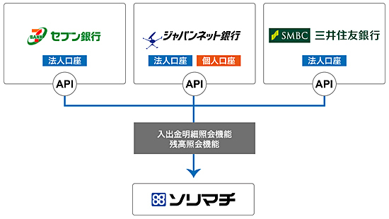 ソリマチ、セブン銀行・ジャパンネット銀行・三井住友銀行とAPI連携
