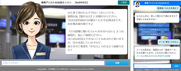 なお、チャットボットのキャラクターには、TBSの社内で作成したオリジナルキャラクター「AoI(あおい)かなえ」を採用している。CAIWAには、運用担当者がユーザーインターフェースを自由にカスタマイズできる機能があり、それを利用して実現した。また、「AoIかなえ」には、完全2Dのまま立体表現を可能にする表現技術「Live2D」を利用。3Dモデルデータを作成することなく、パーツごとに分けた「AoIかなえ」の2Dの画像データを用意しただけで、原画のイメージ、質感を保ちつつ、立体的・インタラクティブな「AoIかなえ」として表現している。これにより、ユーザーはオリジナルキャラクター「AoIかなえ」との対話を通して、必要な情報まで迅速にたどり着くことが可能となった。