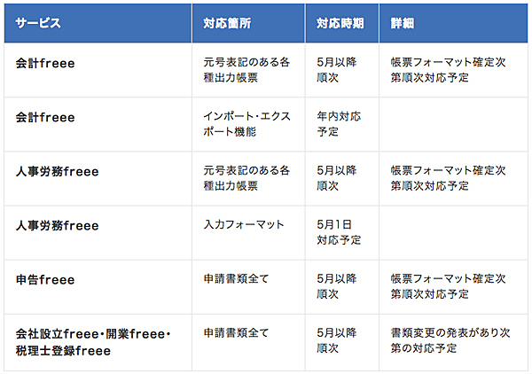 freeeは2日、同社が提供する「会計freee」などの各種サービスの改元対応を5月以降に順次進める方針だと発表した(下図参照)。クラウドサービスのため、ユーザー自身の作業は必要なく、自動的に新元号表記に対応する形となる。なお、各種帳票への新元号の対応は、管轄する省庁・市区町村などの対応方針の発表後になる予定。
