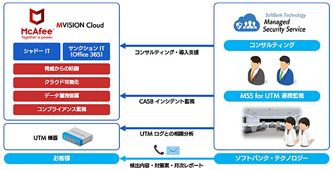 MSS for CASBは、マカフィーが提供する「McAfee MVISION Cloud(旧:Skyhigh Security Cloud)」とSBTがもつMicrosoft Office 365をはじめとしたクラウドサービス導入実績の知見を基に、シャドーITのベースライン策定とサンクションITの推奨ポリシーテンプレートを提供し、MSSとの連携による強固な監視・運用体制を実現する。