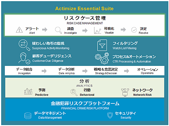 Actimize Essential Suite(日本版)は、これまで同社が提供してきた「NICE Actimize AML/CFTシステム」の廉価版。従来のオンプレミス型とは異なりクラウド上に構築しSaaS型で提供するため、ハードウェア、ソフトウェア、保守サポート費用などのコストを従来製品から3割以上削減することができる。