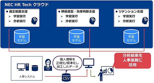 NEC HR Tech クラウドでは、企業が保有する人事や勤怠などの人事管理データをAIがクラウド上で分析する。具体的には、まずモデルとなる社員の人事管理データをAIに学習させて、その企業の特徴を反映した「学習モデル」を作成。その後、対象となる社員の人事管理データと学習モデルを使用し分析することで、業務適性などを数値化する仕組みだ。
