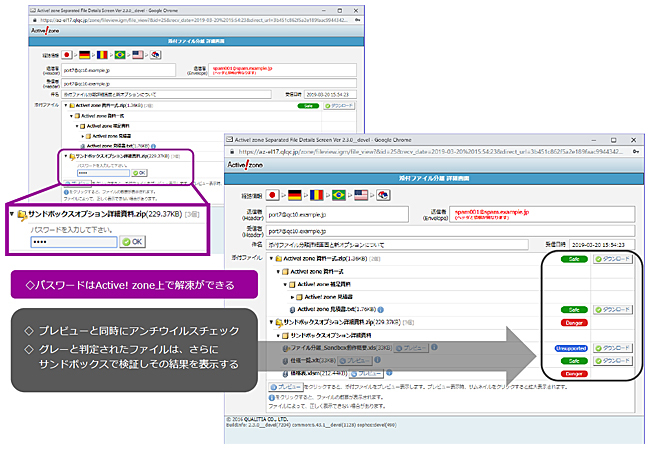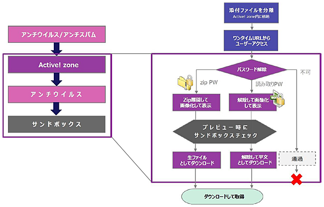 今回の「サンドボックスオプション」は、通常のサンドボックスとしての使い方はもとより、Active!zoneの「添付ファイル分離機能」との併用によって、サンドボックスをそのまま通過していたパスワード付きファイルの中身も検知可能となることが最大の特徴。標的型メール攻撃に対し、これまでにない検知階層と漏れのないウイルスチェックを実現することで、未知の脅威に対する恐れをなくし、より強固なセキュリティー体制を一括で支援する。