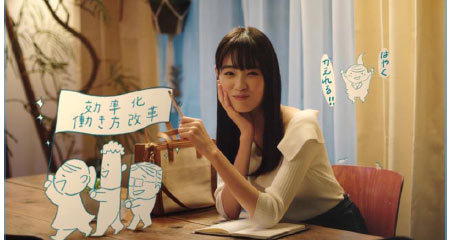 CMのストーリーは、仕事ばかりだった母の帰りが最近早くなり、幸せを感じている高橋ひかるさん。母の帰りが早いのは、社内のデータを連携させたら効率があがったからと聞いて、働き方改革やERPシステムについて、彼女なりに想像している様子を、映像に線画をのせることで表現した。