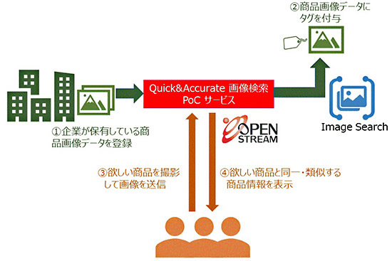 今回提供するQuick&Accurate 画像検索 PoC サービスでは、企業が商品画像データを簡単に登録し、画像検索できるツールの提供と、PoC用デモサイトの作成をオープンストリームが行う。企業は手間や時間をかけずに高速・高精度な画像検索エンジンを検証できるようになるという。