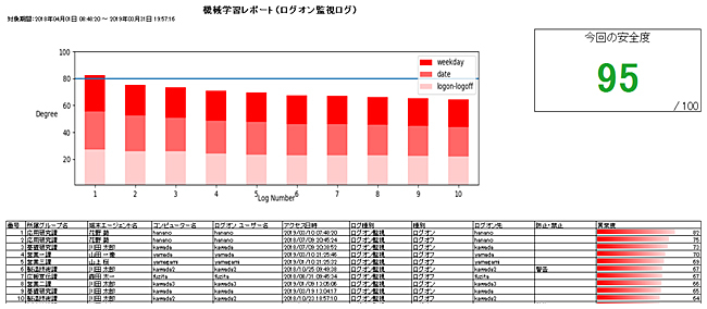 最新版では、機械学習(AI)による高度なログ分析/レポート出力に対応した。管理者は、AIレポートを基に従業者の業務上の異常や傾向をさまざまな視点から捉えることができる。例えば、PCのログオン/ログオフ時間の異常を分析し、過度な時間外労働の是正に生かすことができる。
