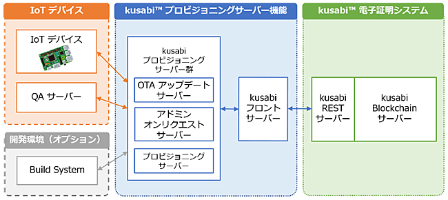 同サービスは、「kusabiプロビジョニングサーバー機能」「kusabi電子証明システム」「IoTデバイス」「開発環境」の4種類のコンポーネントで構成されている。一般的な実証実験であれば、kusabiプロビジョニングサーバー機能とkusabi電子証明システム、IoTデバイスの3種類で実現可能。また、顧客が用意したIoTデバイス環境で検証を行いたい場合のカスタマイズ向け開発環境をオプションで用意するほか、顧客が保有するサーバー上にプロビジョニングサーバー機能を顧客自身で構築できるようにするオプションなど、さまざまな要件に対応できるメニューも選択することができる。