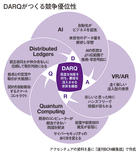 一方、あらゆる企業にとってSMACへのフォーカスは依然として重要だが、さらにその先の競争優位を生み出す技術こそがDARQだと強調。「ブロックチェーンを用いた国際海運業務の改革、AIによる自動画像補正のクラウドサービス、VRゲーム上で1000万人が同時参加したDJイベント、量子コンピューティングを活用した配送・積載業務の効率化など、それぞれの技術の活用例も出てきつつある。DARQテクノロジーはユーザーのビジネスの競争力を飛躍的に高める要因になり得るし、そうしたトレンドはすでに始まっている」という。