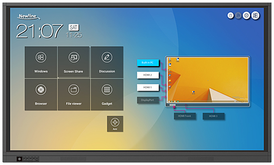 また、独自のワイヤレスプレゼンテーションソフトウェア(Newline Cast)により、パソコンやタブレットなどの画面をタッチスクリーンにワイヤレスで共有することが可能。さらに、ワイヤレスブロードキャスティング(Newline Broadcast)によって、タッチスクリーンで行っている画面をユーザーの手元のパソコンやタブレットなどに配信することができる。
