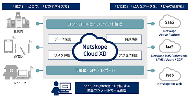 Netskopeは、セキュリティリスクの高いアクティビティの検出、機密性の高いデータの保護、脅威の拡散阻止、インシデントへの対応など、クラウドサービスの安全な利用やコンプライアンスの順守を支援するソリューション。