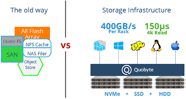 Quobyteが提供するストレージ基盤は、従来型のオールフラッシュ、NAS、オブジェクトストレージ、SANストレージなどの各種ストレージが個別に持っていた役割を一つのプラットフォームにまとめてサービスするもの。標準的なLinuxサーバーを複数用意するだけで、障害に強く高い性能と豊富なストレージ関連サービスを提供するプラットフォームを容易に提供することができる。使われるサーバーは異機種混在が可能であり、増設時には最新のモデルを追加することも可能となっている。