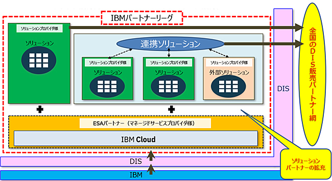 今回の合意により、DISは日本IBMとの協業で、クラウド基盤の製品やサービス(IBM Cloud)を、ソリューションプロバイダーが取り扱うソリューションと連携させ、自社の商流を通じて提供ができるESA(Embedded Solution Agreement)テックブローカー(ディストリビューター)契約を取り交わし、IBM Cloudのサービス提供を行う。ソリューションプロバイダーは、日本IBMとESAパートナー契約を結ぶことで、IBM Cloudの豊富なサービスを利用できるようになる。