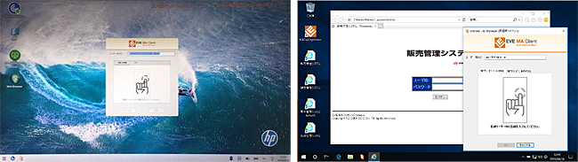 具体的には、HP ThinPro搭載のシンクライアント端末や、「HP ThinPro PC Converter」によってシンクライアント化されたPCで、Citrix Workspaceのログイン認証とCitrix Virtual Desktops上のMicrosoft Windows 10 Pro上で動作するEVE MA IDマネージャーに登録した業務アプリケーションのログイン画面に、EVE MAの多要素認証を適用することができる。