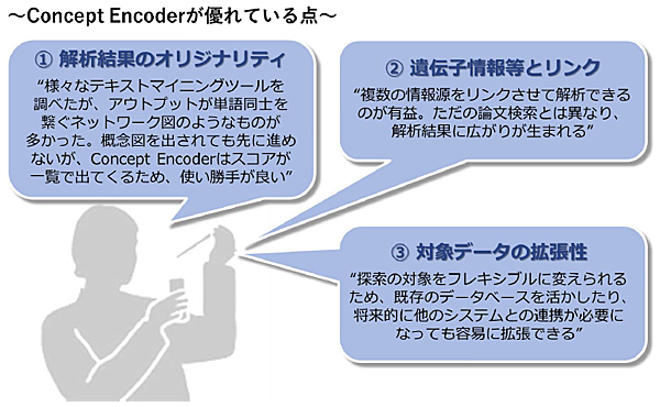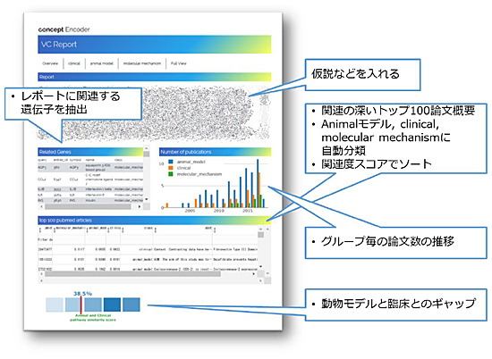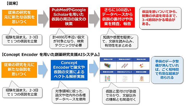 ベクトル演算によるAI解析を行うため、辞書登録型のAIと比べ、使用方法が検索ツール並みに容易。さらに、処理が軽いため、オンプレミスの場合、数百万円レベルのサーバーでの稼動が可能で、スーパーコンピュータや大規模サーバー群などの大型設備も不要となる。これらにより、従来の創薬研究では、仮説から開発承認まで約3-4週間かかっていた時間を大幅に短縮できる効果が見込まれる。