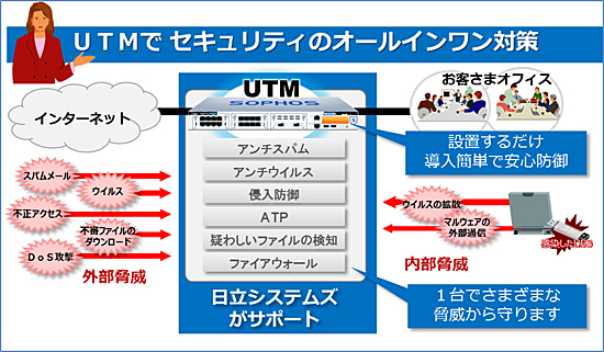 UTMが社外からの攻撃などを検知した場合は、通信の遮断を自動的に行うことでマルウェアの社内への侵入を防止する。サンドボックスの機能も備えており、ダウンロードした疑わしいファイルについては隔離した安全な場所での確認が可能なため、社内への侵入前に検知・駆除することができる。さらに、日立システムズのコンタクトセンターが、UTMで検知した脅威情報の報告を行うほか、UTMが故障した際の機器障害の受け付け、代替機の送付、運用での問い合わせ対応などをサポートすることで、顧客の運用負担を軽減する。