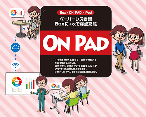 その一つがBoxと連携してペーパーレス会議を実現するiOSアプリケーション「ON PAD」。「プレビューモード」と「保存モード」を使い分けて会議の主催者が指定するページを出席者に連動させたり、出席者が資料にメモを書き込んだりできる。アプリケーションはApp Storeからダウンロードするので、導入企業がサーバーを用意する必要はない。