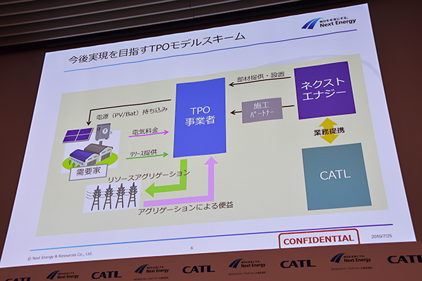 ネクストエナジーは、CATLの蓄電池と自社の太陽光発電設備を組み合わせてTPO事業者に提供するビジネスモデルを構築していく。CATLと提携することで蓄電池の安定的な供給ルートを確保し、トータルの導入コストを低減することで日本国内での販売拡大を図りたい考えだ。
