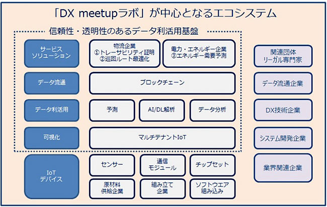 DX meetupラボでは、AIやブロックチェーン、IoTなどの技術と、データを利活用する場を提供するとともに、パートナー企業間の連携を推進する触媒の役目を担う。これにより、パートナーとともに技術活用や実証実験、研究活動のほか、データ駆動型社会に新しい価値を届けるビジネスの開発を目指す。