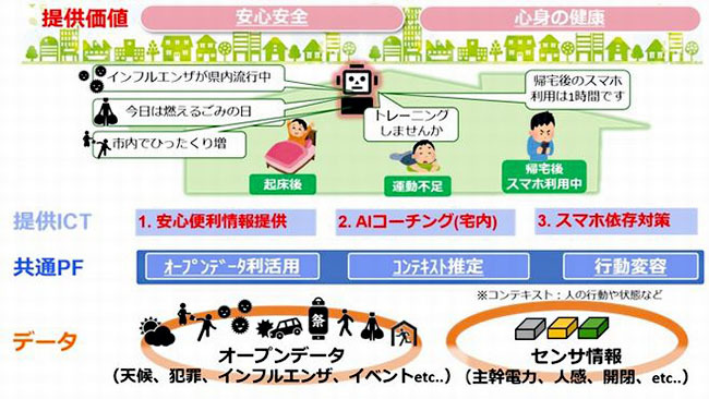 今回の実証実験では、ふじみ野市がこれまで取り組んでいる安心安全で心身の健康を促進する取り組みと連携し、ふじみ野市の住民を対象に行う。具体的には世帯に応じたまちの安心便利な情報をタイムリーに届ける「安心便利情報提供」、受け入れやすいタイミングでトレーニングを促し、トレーニング方法をアドバイスするとともに、健康増進につながる情報を届ける「AIコーチング」、中高生のスマホ依存に関する悩みの解決を目指す「スマホ依存対策」などを実施する。