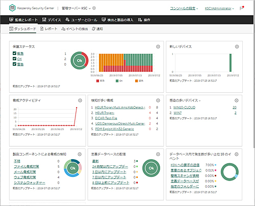 Kaspersky Security Centerは、ウェブブラウザーに対応した。新たにウェブコンソールを搭載し、ウェブブラウザーを通してエンドポイントのセキュリティ設定と管理を行うことができる。視認性を重視したデザインを採用し、タブレット端末などのタッチスクリーンにも対応したことで、より容易な管理が可能になる。