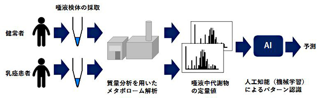 浸潤性乳がん、非浸潤性乳がん、健常者の計166の唾液検体を収集し、メタボローム解析を実施。解析の結果、測定した物質の濃度パターンをAIに学習させたところ、高精度に乳がんを識別できるようになった。