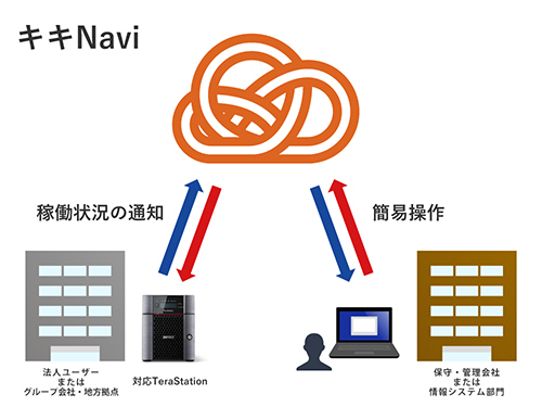 キキNaviは、インターネットを経由して遠隔のTeraStationとその管理者をつなぐリモート管理サービス。HTTPS通信ができる環境であれば特別なネットワーク設定は不要で、TeraStationの状態を常に監視できる。障害発生時には管理者に通知し、管理者は、遠隔でNASの状態を監視できることに加えて、NASの再起動やシャットダウン、デバッグログの取得やファームウェアのアップデートを行うことができる。