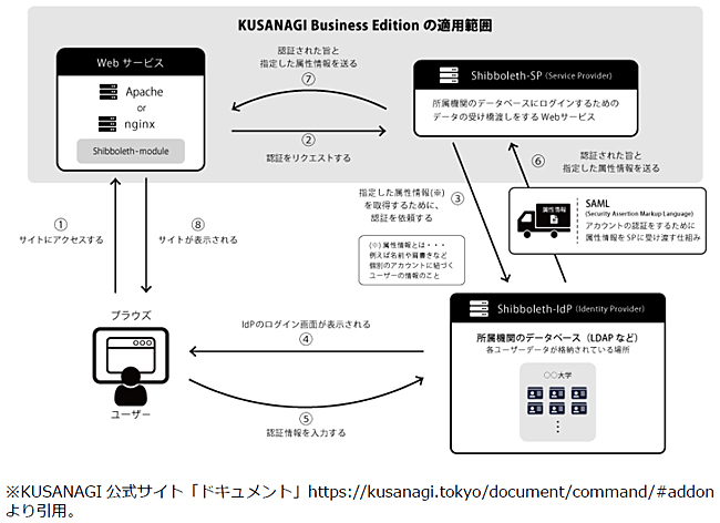 今回のnginx/Apache対応シボレス認証機能は、KUSANAGI Business Edition環境上にウェブサービスをマイグレーションし、シボレス認証機能に関する設定を行うことでシボレス認証によるシングルサインオンを利用できる。また、シボレス認証を実現する際のウェブサーバーとして一般的なApacheに加えて、現在、世界的にシェアを拡大しているnginxでも、シボレス認証を容易に実現できる。