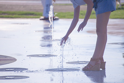 熱中症対策の具体例としては、温度や湿度が高いエリアに街の緑化箇所の増設や噴水・水景施設の活用など、効率的なヒートアイランド対策を街づくりの観点から検討していく。また、各拠点の温度・湿度データは、子供の屋外活動や登下校時に、水分補給のアナウンスなど、リアルタイムの通知を行うなどのデータ活用方法も検討していく。