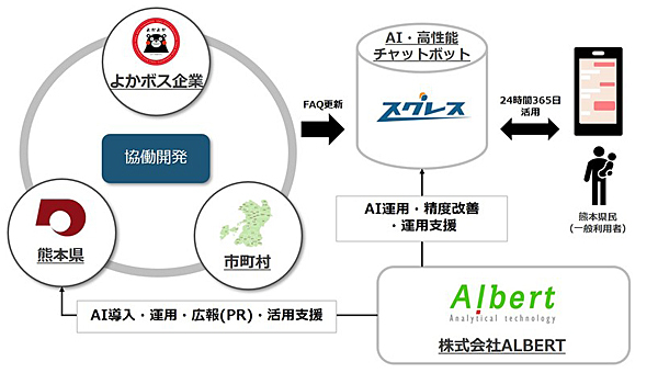 熊本県では、子どもを安心して産み育てられる環境づくりのため、結婚、妊娠、出産、子育ての各ステージにおける支援に取り組んでいる。慣れない家事育児のストレスなどに悩む県民が増えている現状を解決するため、子育てに関する行政窓口の問い合わせ自動化システムを設置することを決めた。そこでAIを搭載した高性能チャットボットサービス「スグレス」を提供しているALBERTに開発を依頼した。「スグレス」は問い合わせの自動応答やLINEなどとの連携ができ、自動学習機能を搭載しユーザーの知りたい情報を的確に即時回答することができる。