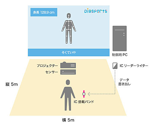 DigSportsは、利用者の動きを3次元で検知するセンサー、大型モニター、独自の測定・分析プログラムで構成される。約5×5mの広さがあれば、文部科学省の新体力テスト項目のうち4項目(反復横跳び、50メートル走、ボール投げ、立ち幅跳び)の測定を行うことができるほか、垂直跳び、持久走も測定可能。独自のアルゴリズムに基づきモニター前での動きから記録を推定するため、大掛かりな設備や多数の記録員が不要で、屋内の限られたスペースに常設したり、イベントの出展ブース内で計測したりなど手軽に利用できる。