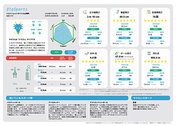 身体測定や体力測定の結果をもとに、一人一人の長所をAIが分析。オリンピック種目を含む74種類の競技の中から、どれに向いているか、AIが提案する。アスリート指導の専門家で元全日本フリースタイルスキーチームフィジカルコーチの経歴を持つ遠山健太氏が考案したスポーツ適性診断メソッドを応用したアルゴリズムを実装。個々の体格や体力に応じて、適性が高いスポーツ種目を推定できる。また、スポーツが上達するためにはどのような運動をすればいいかというアドバイスも得ることができる。