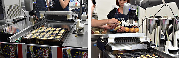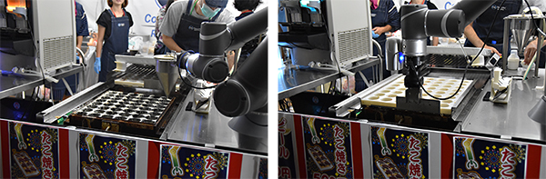 たこ焼きが焼きあがった後のたこ焼きを船皿に移し、カツオブシや青のりなどをトッピングする作業は人の行程となる。こうして人とロボットが協働することで、人が熱い鉄板に向き合って調理する必要がなくなり、また通常では3~4人で運営するたこ焼き店舗を1人で行えるようになり、省人化の効果も期待できる。