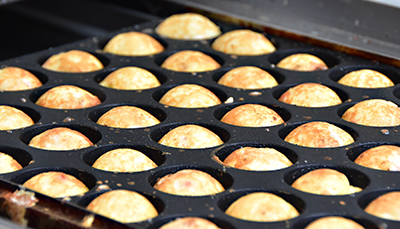 「オクトシェフ」は、たこ焼きのタネ、タコを注入し、たこ焼きを焼き、バットに移すところまで自動で行う。タネやタコを注入した後は、プレートをゆすりながら千枚通しを使ってたこ焼きを穴から剥がし、丸めていく。これは人が行う場合、経験が必要な作業だ。