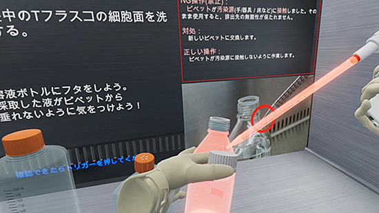 VRトレーニングソリューションでは、無菌室内の設備である安全キャビネットや細胞培養に使用する細胞培養用フラスコ、電動ピペッターといった専用の器具を用いた無菌操作を仮想空間内に再現する。培養細胞や培養液、ボトル・細胞培養用フラスコ・ピペットといった器具と作業者の手の位置・角度・接触などの状態から「(無菌操作に好ましくない)コンタミネーションリスクの高い操作」を抽出して作業の正確さをチェックする。これらのチェックポイントは、人間工学に基づいた遵守事項に抵触する行為を、NECソリューションイノベータが体系化したもの。