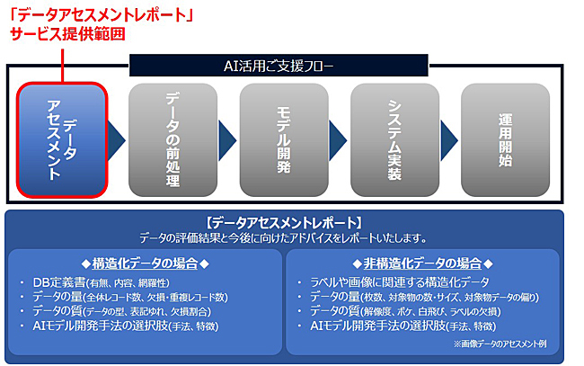 AI活用は一般的に「データアセスメント」「データの前処理」「モデル開発」「システム実装」「運用開始」という段階を踏んで進めていく。同サービスでは、第一段階となる「データアセスメント」の部分を切り出して提供するもの。