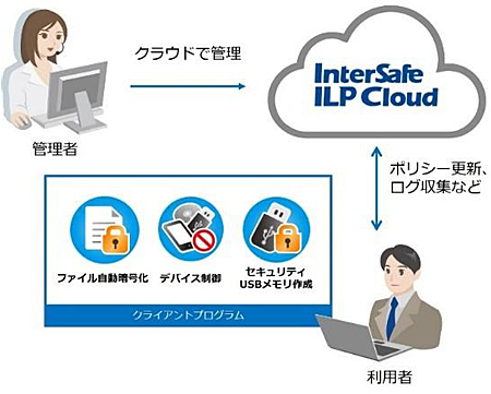 InterSafe ILPは、情報の「持ち出し・持ち込み制御」と「持ち出し後の安全な活用」を実現し、企業の課題に合わせた自由な組み合わせで導入が可能なシリーズ製品群。今回、企業のクラウドサービス利用へのニーズに対応した、柔軟で迅速な情報セキュリティ対策を可能にするため、現在オンプレミス環境で利用できるInterSafe ILPのうち、「ファイル自動暗号化」「デバイス制御」「セキュリティUSBメモリ作成」の3つの機能について、新たにクラウド版をラインアップに追加し、InterSafe ILP Cloudとして提供する。