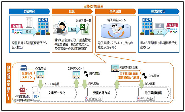 実施期間は5月9日から6月30日まで。AI-OCR・RPAとの親和性が高く、業務プロセスの改善が必要な保育課の「保育施設運営費支出」、人事課の「研修評価シート集計」という2業務を対象に実施した。なお、AI-OCRツールとしてAI inside製「DXsuite」、RPAツールとしてNTT-AT製「WinActor」を使用した。