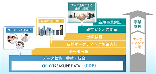 具体的には、ソフトバンク独自のデータと博報堂グループが保有する生活者のデータに加え、Armのカスタマーデータプラットフォーム「Arm Treasure Data enterprise CDP(eCDP)」を活用し、顧客企業が独自に保有するファーストパーティーデータを集約。パートナー企業のデータであるセカンドパーティーデータや、サードパーティーデータと組み合わせて分析した上で、「Arm Treasure Data eCDP」と連携する各種マーケティングツールなど外部システムを活用した施策を実行できる。