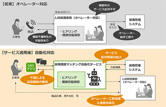 これにより、パーソルワークスデザインでは、アルバイト・パートの応募受付から面接日程の調整までを自動化し、オペレーターの工数を大幅に削減する。また、これまで対応が難しかった早朝や深夜でも24時間365日、いつでも応募受付が可能となるSNSを活用して質問に答えるだけで、即日面接日や場所が確定するなど応募者の利便性が大きく向上し、応募離脱の解消にもつながる。