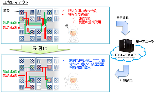 OKIデータのLED統括工場では、製造工程の異なる複数の製品が数十~数百台の半導体製造装置を共用し、装置間を作業員が移動して製造していた。そのため、生産性向上のため、装置の配置を最適化し、作業員の移動距離をできるだけ短くする必要があった。しかし、装置の台数、種類が多いため、組み合わせのパターン数は爆発的に増加し、今回のケースでも10の100乗を優に超える数になる。スーパーコンピューターのような高性能な従来型コンピューターを用いても全てを計算して最適な装置配置を算出することは現実的には不可能だった。