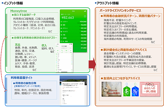 今回は18年度に実施した検証結果を受けて、新たに小売業やサービス業などの異業種企業と連携のもと販促情報提供などの機能改善し、実サービス提供に向けて検証を行うもの。前回同様、マネーツリーの協力により使用承諾を得た個人金融情報や「Personetics Engage」を活用する。