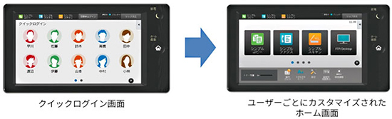 アイコンにタッチするだけで、ユーザーごとにカスタマイズされたホーム画面に簡単ログインできる「クイックログイン」機能を搭載。PCから送信した印刷データが、ログイン後にのみ出力されるように設定することができる。